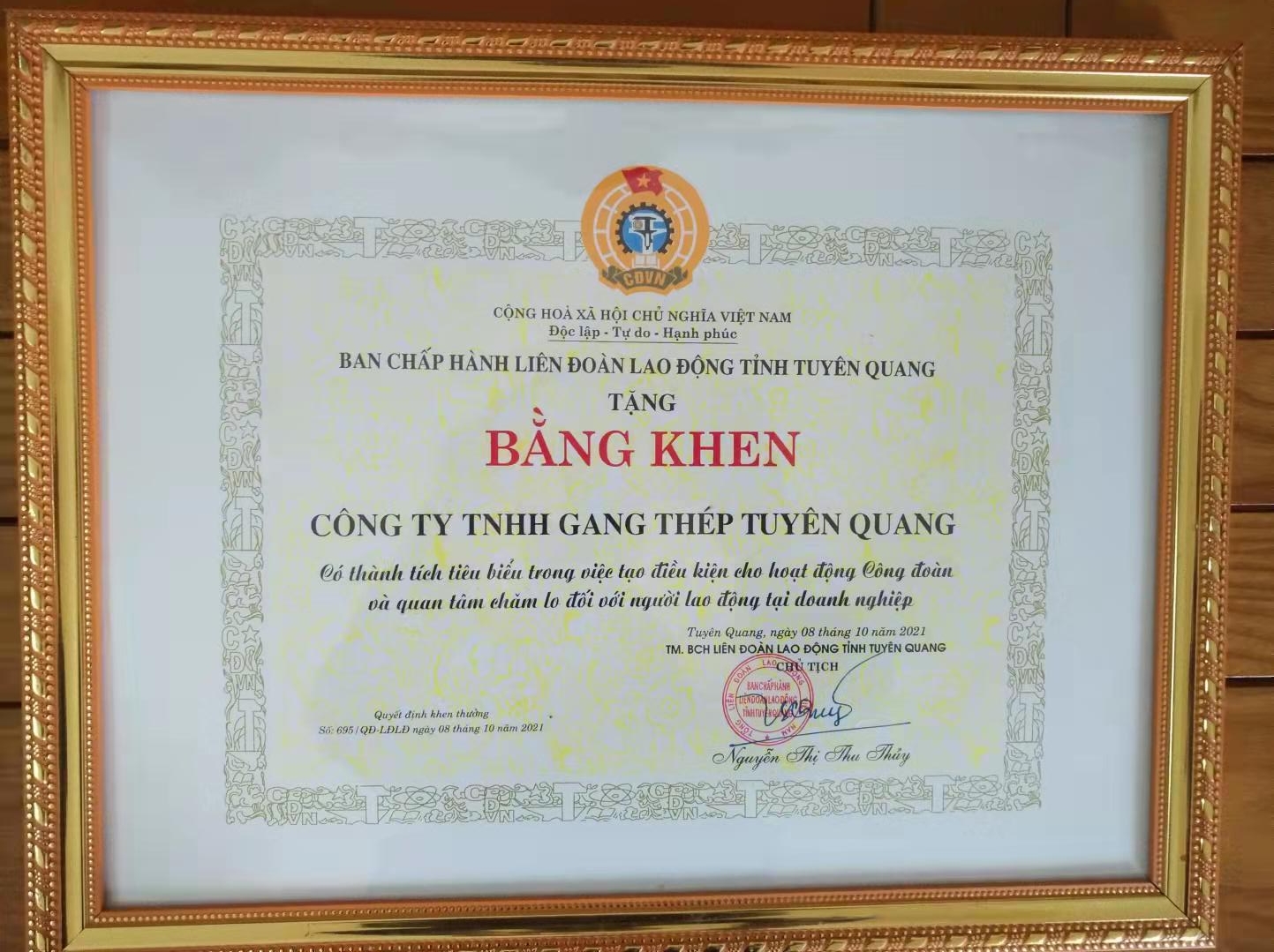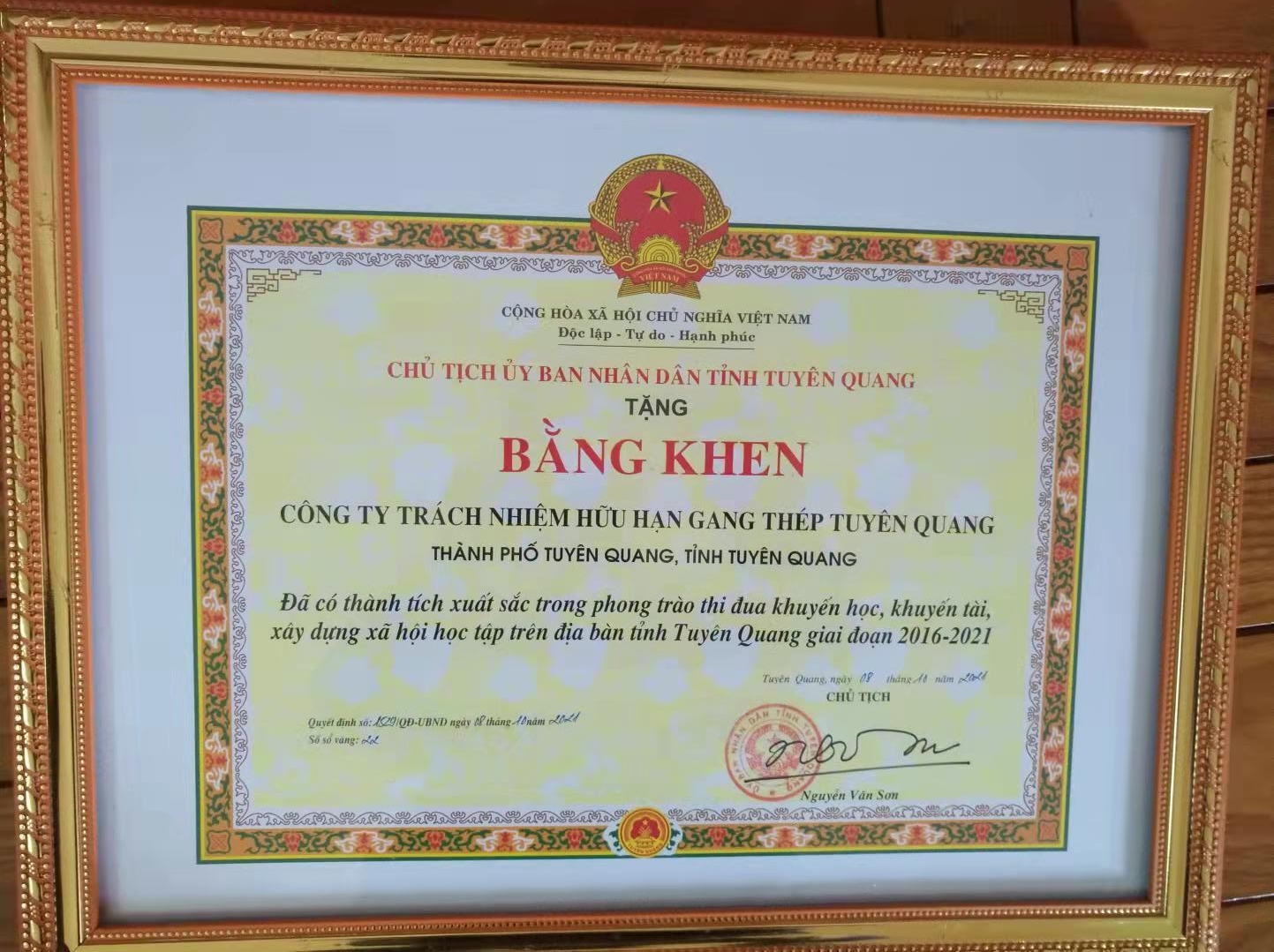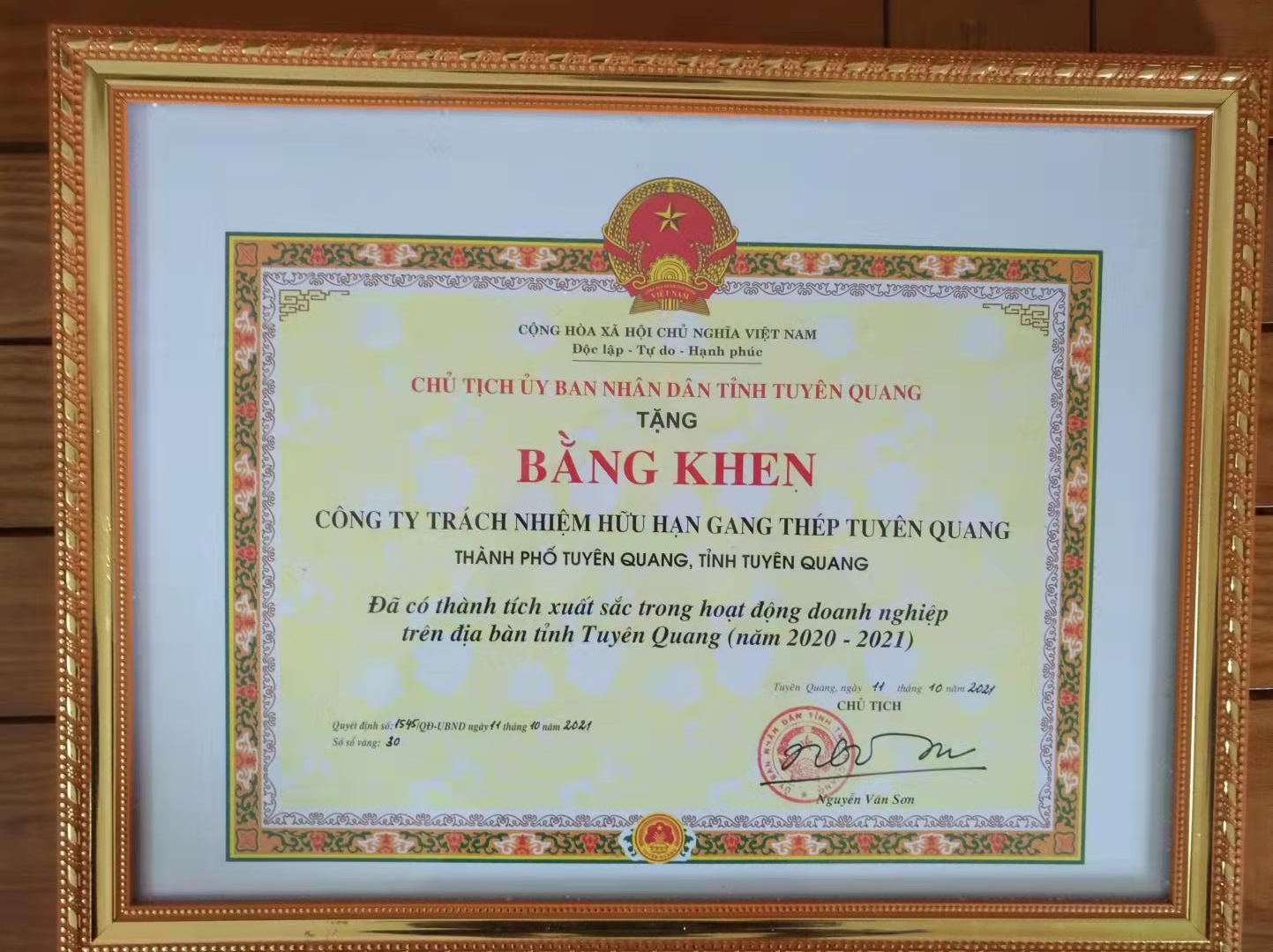越南宣光省政府頒發(fā)的省長獎狀一,旨在獎勵宣光鋼鐵有限責任公司在宣光?。?020年—2021年)企業(yè)活動中取得優(yōu)異成績;越南宣光省政府頒發(fā)的省長獎狀二,旨在獎勵宣光鋼鐵有限責任公司在宣光省2016年—2021年度的社會建設(shè)學習、勸學、助才競賽活動中成績優(yōu)異。前兩份獎狀均由越南宣光省省長阮文山簽字。越南宣光省勞動聯(lián)合執(zhí)委會頒發(fā)的獎狀三,旨在獎勵宣光鋼鐵有限責任公司為工會創(chuàng)造活動條件,關(guān)心、照顧勞動者上成績突出。該獎狀由宣光省勞動聯(lián)合執(zhí)委會主席阮秋水簽字。? ? ??