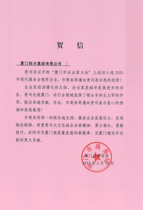 廈門市商務(wù)局發(fā)來賀信,祝賀廈門恒興集團成功入選2021年現(xiàn)代服務(wù)業(yè)領(lǐng)軍企業(yè)。