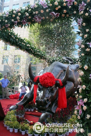 正式儀式開始前,全場來賓共同進行了一場隆重而莊嚴的升旗儀式。五星紅旗、恒興集團和財富中心的旗幟冉冉升起,預示著“廈門財富中心”這一嶄新而富有生機 的海西明珠已在鷺江道百年商圈灼灼閃耀。緊接著,廈門市領導徐模、陳昭揚、葉重耕、翁云雷與恒興集團柯希平董事長為財富中心吉祥物“財富金?!苯也剩谝?陣連續(xù)歡騰的開鑼聲中揭開了金牛的神秘面紗,也正式拉開了落成慶典的序幕。