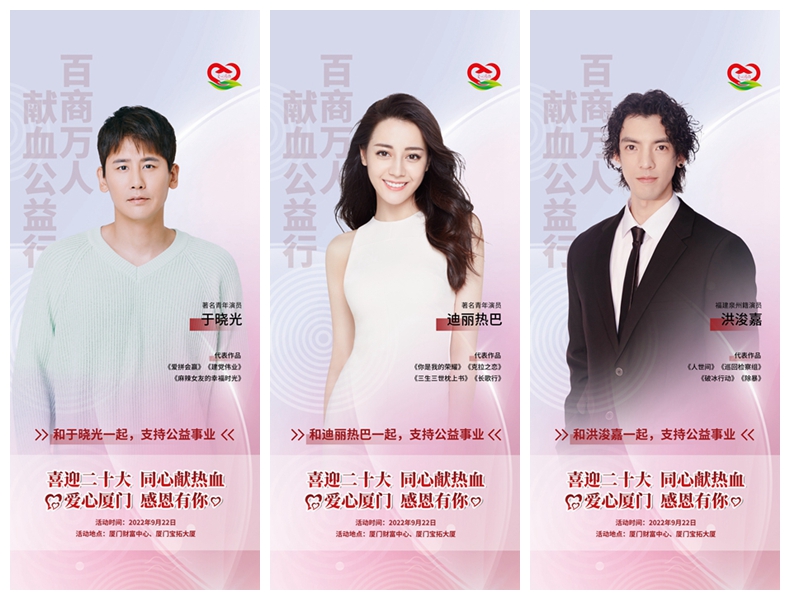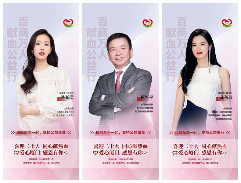 【廈門晚報(bào)】9月22日,由市工商聯(lián)(總商會(huì))發(fā)起,并聯(lián)合廈門市中心血站、廈門恒興集團(tuán)主辦的“百商萬人獻(xiàn)血公益行”活動(dòng),將在廈門財(cái)富中心和寶拓大廈同時(shí)舉辦。近日,迪麗熱巴、陳都靈、龔蓓苾、洪浚嘉、于曉光等影視演員紛紛為廈門這一公益活動(dòng)發(fā)聲,拍攝視頻送上祝福,傳遞“愛心廈門 感恩有你”的正能量,號(hào)召愛心志愿者們助力廈門無償獻(xiàn)血公益事業(yè)。